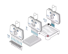 - mechanická pipeta s nastavitelnou vzdáleností konusů pro nasazení špiček. Vhodná pro přenášení kapalin mezi dvěma rozdílnými formáty ( zkumavky - destičky atd.)